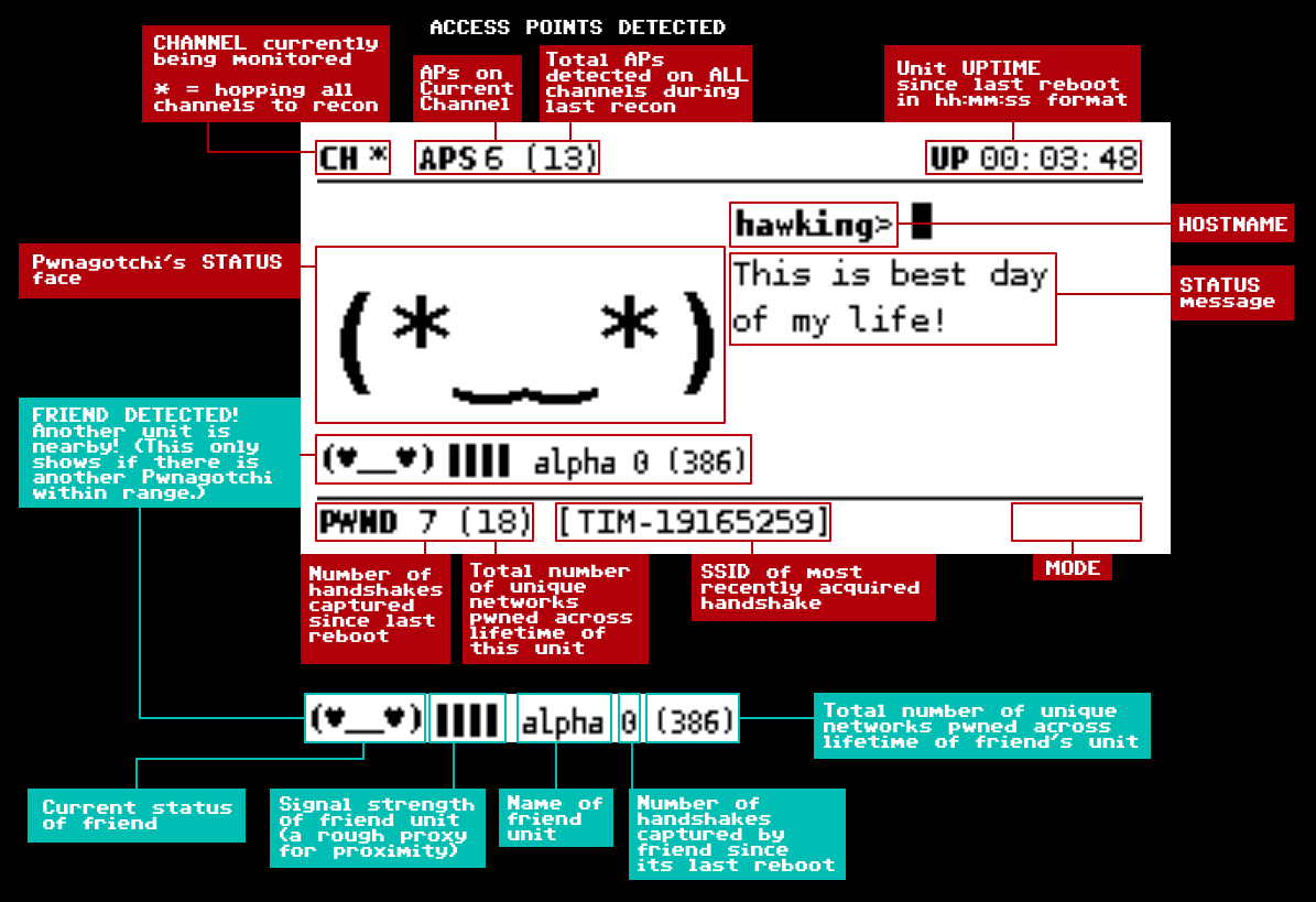 Pwnagotchi is an A2C-based "AI" leveraging bettercap that learns from its surrounding WiFi environment to maximize the crackable WPA key material it captures (either passively, or by performing authentication and association attacks). This material is collected as PCAP files containing any form of handshake supported by hashcat, including PMKIDs, full and half WPA handshakes.
