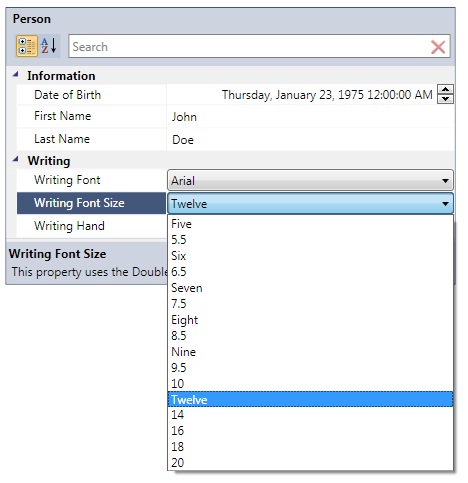 Sometimes it is desirable to want to provide a collection of values represented by a ComboBox for a given property. The PropertyGrid supports this scenario by creating a class that implements the IItemsSource interface and decorating your property with the ItemsSourceAttribute.