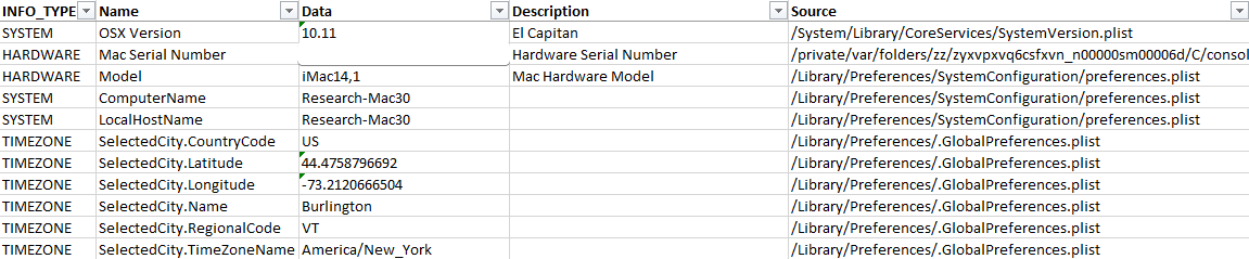 | TIMEZONE | Timezone and Location Information * SelectedCity.CountryCode : country code of the country that the computer's city is located in * SelectedCity.Latitude : latitude of the city the computer is located in * SelectedCity.Longitude : longitude of the city the computer is located in * SelectedCity.Name : name of city * SelectedCity.RegionalCode : state abbreviation * SelectedCity.TimeZoneName : name of the timezone * SelectedCity.Version : version of timezone * TimeZone Set : name of timezone set on machine |