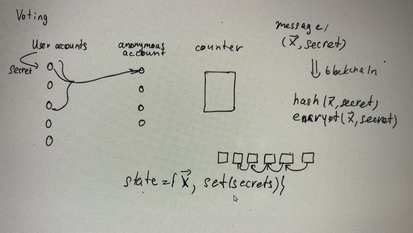 message = {voting_vector, secret}and snark proof that message is correct and encryption is correct. - After the end of voting counters MapReduce all messages from last to first via snarks without publishing any subtotals. If the secret is new, we increment subtotal vector and add the secret to set of known secrets during the counting (how to do it is described here ). If the secret is not new, we pass the addition and just update the state's salt to hide from others that the secret is not new here.