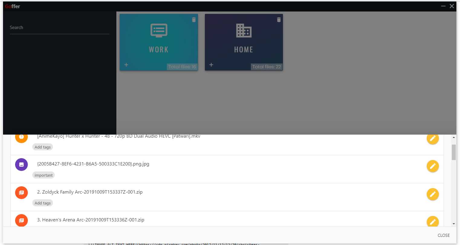 This is a file manager, with a beautiful and easy to use UI, that lets you segregate files based on categories and tags. The main segregation is done based on categories and you can add tags to each file. Then later on you can search based on either file name or tag.