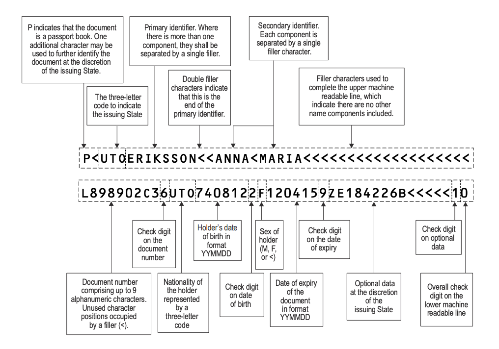 The diagram below, taken from the ICAO specifications, summarizes in details how the MRZ is structured.